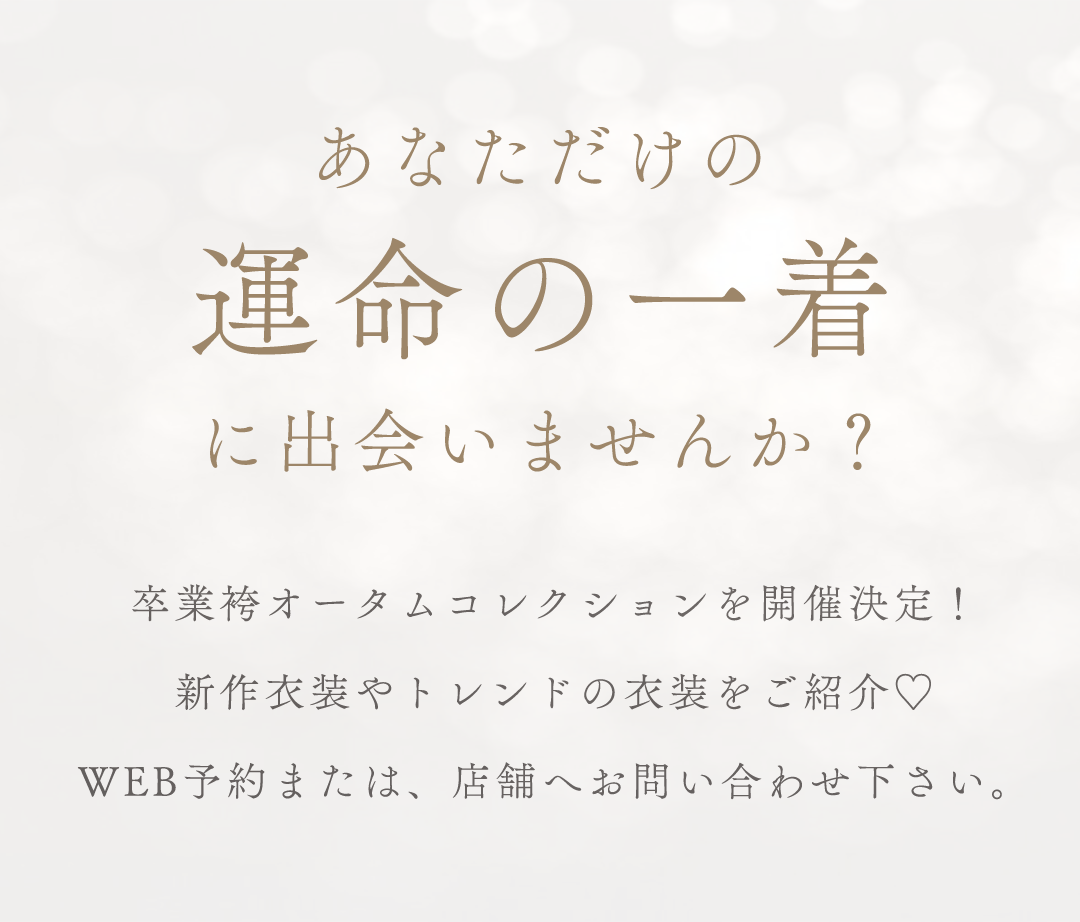11月開催!卒業袴オータムコレクション★ 2025.10.18 LATEST EVENTS 11月開催!卒業袴オータムコレクション★ 10月開催!卒業袴オータムコレクション★ 今一番人気のプラン教えます♥新プラン【エクラ】登場!