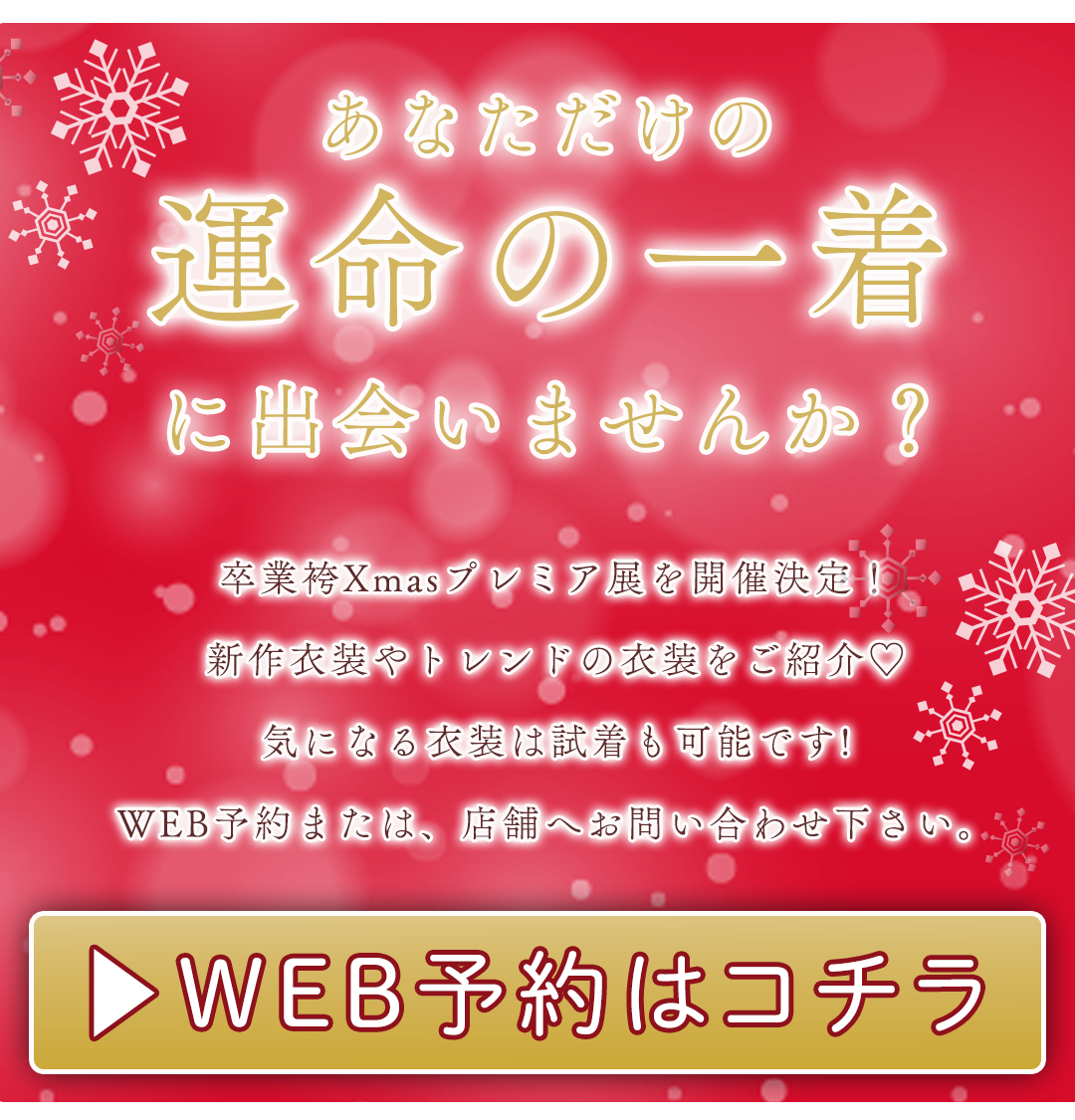 卒業袴レンタル受付中!Xmasプレミア展♡ 2025.11.14 卒業袴 お問合せ・ご予約 フォーム お近くの店舗をお選び下さい。後ほど、該当店舗の担当者からご連絡をさせて頂きます。 店舗選択 必須 —以下から選択してください—古河本店イオンモール下妻店インターパーク宇都宮店ベルモール宇都宮店ハーヴェストウォーク小山店イオンタウン真岡店アリオ鷲宮店イオンモール上尾店ウニクス南古谷店大宮マルイ店 お名前 必須 ふりがな 郵便番号 必須 ご住所 必須 ご連絡のつきやすい電話番号 必須 メールアドレス ※ご入力されたメールアドレスにご入力情報メールが配信されます。 お問合せ・連絡事項がある場合はご記載ください ご来店ご予約をご希望の場合は、ご希望日&時間区分をご選択ください ※本日より4日後から日程を選択できます ※場合により日時の再調整をお願いする場合がございます 予めご了承ください。 ※定休日:古河本店/月曜日(祝日は営業) 真岡店/火曜日(祝日は営業) 南古谷店/火曜日(祝日は営業) 大宮店/火曜日(祝日は営業) ご来店ご予約ご希望日 ご来店ご予約ご希望 時間区分 —以下から選択してください—午前午後どちらでも LATEST EVENTS 卒業袴レンタル受付中!Xmasプレミア展♡ 11月開催!卒業袴オータムコレクション★ 10月開催!卒業袴オータムコレクション★