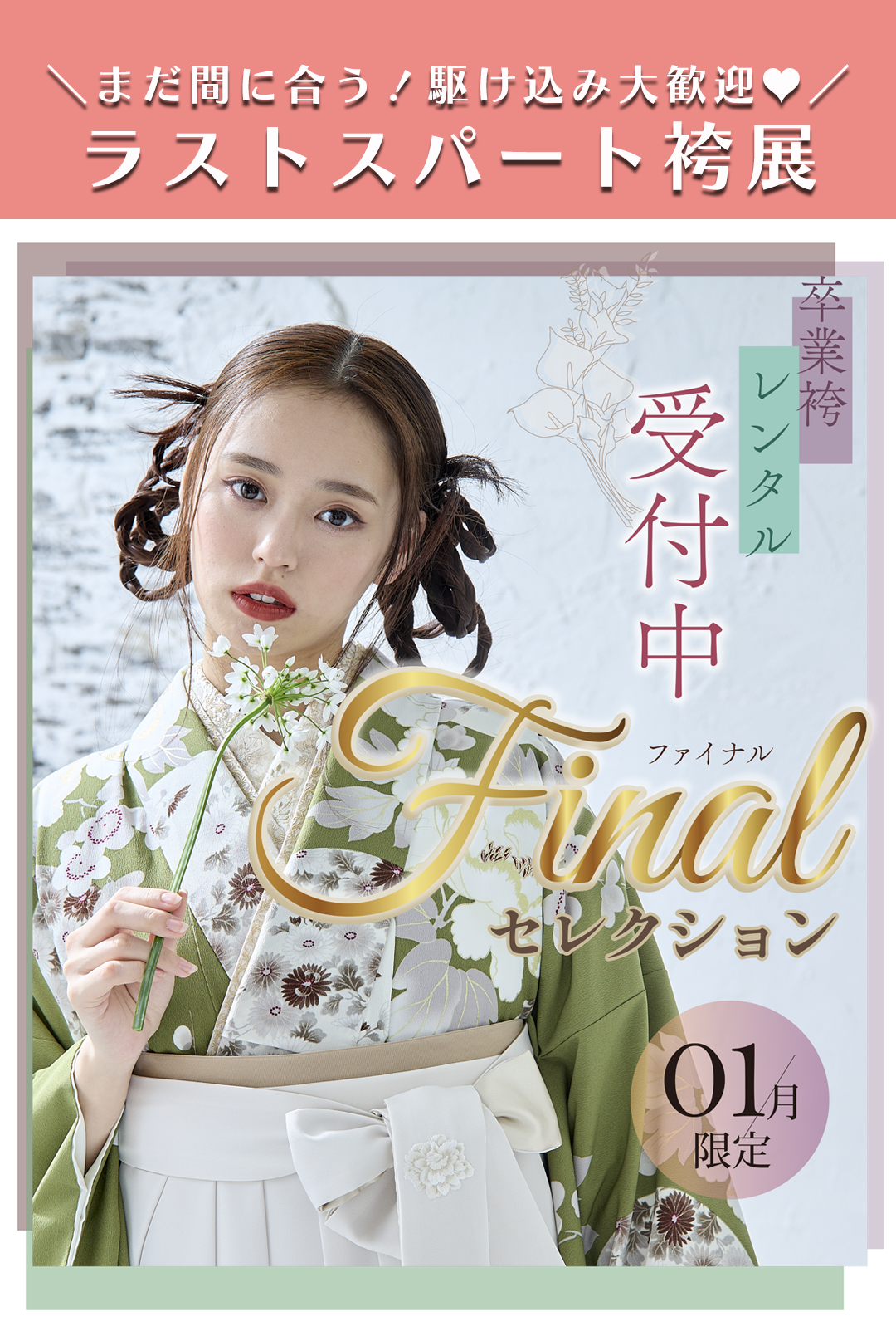 1月限定★卒業袴Finalセレクション 2025.12.11 卒業袴 お問合せ・ご予約 フォーム お近くの店舗をお選び下さい。後ほど、該当店舗の担当者からご連絡をさせて頂きます。 店舗選択 必須 —以下から選択してください—古河本店イオンモール下妻店インターパーク宇都宮店ベルモール宇都宮店ハーヴェストウォーク小山店イオンタウン真岡店アリオ鷲宮店イオンモール上尾店ウニクス南古谷店大宮マルイ店 お名前 必須 ふりがな 郵便番号 必須 ご住所 必須 ご連絡のつきやすい電話番号 必須 メールアドレス ※ご入力されたメールアドレスにご入力情報メールが配信されます。 お問合せ・連絡事項がある場合はご記載ください ご来店ご予約をご希望の場合は、ご希望日&時間区分をご選択ください ※本日より4日後から日程を選択できます ※場合により日時の再調整をお願いする場合がございます 予めご了承ください。 ※定休日:古河本店/月曜日(祝日は営業) 真岡店/火曜日(祝日は営業) 南古谷店/火曜日(祝日は営業) 大宮店/火曜日(祝日は営業) ご来店ご予約ご希望日 ご来店ご予約ご希望 時間区分 —以下から選択してください—午前午後どちらでも LATEST EVENTS 1月限定★卒業袴Finalセレクション 年内ラストチャンス!卒業袴プレミアム展★ 卒業袴レンタル受付中!Xmasプレミア展♡