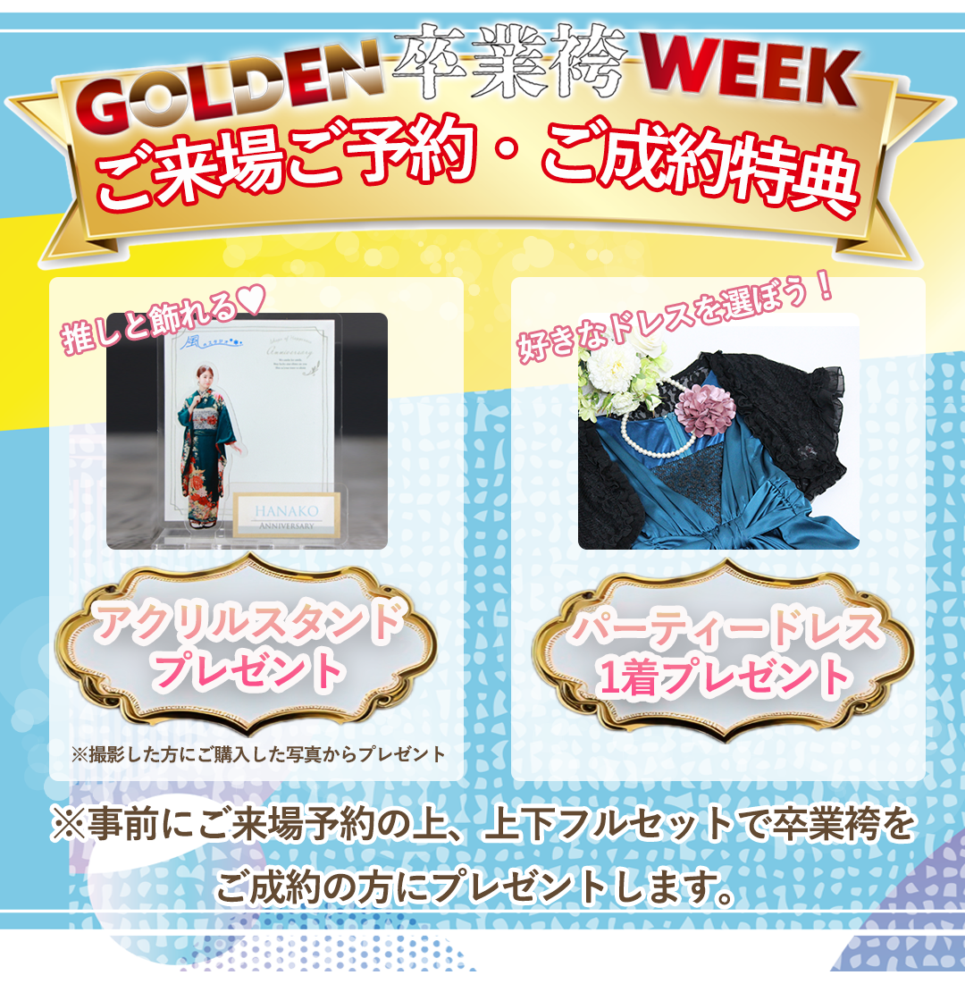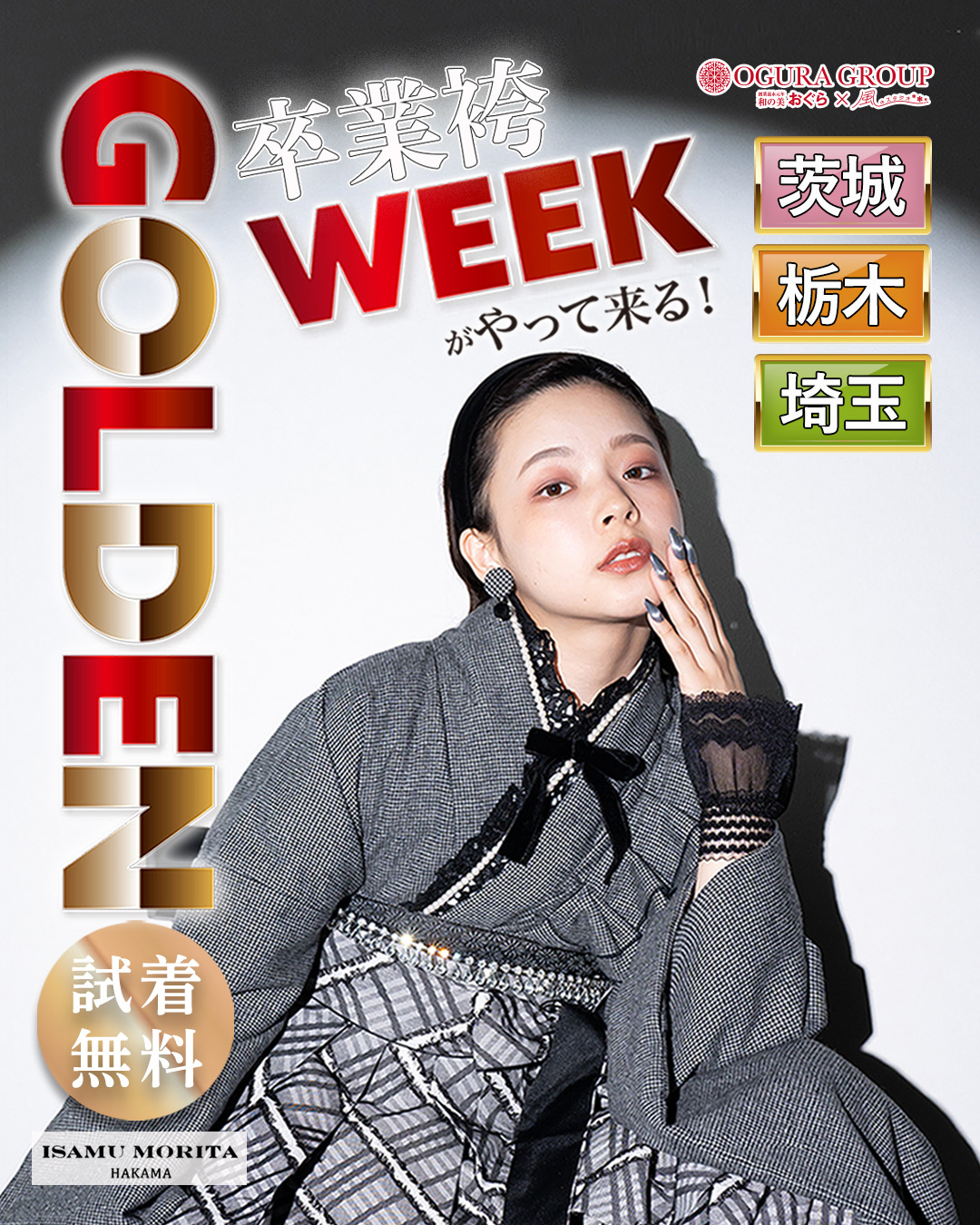 GOLDEN 卒業袴 WEEKがやってくる! 2026.04.05 卒業袴 お問合せ・ご予約 フォーム お近くの店舗をお選び下さい。後ほど、該当店舗の担当者からご連絡をさせて頂きます。 店舗選択 必須 —以下から選択してください—古河本店イオンモール下妻店インターパーク宇都宮店ベルモール宇都宮店ハーヴェストウォーク小山店イオンタウン真岡店アリオ鷲宮店イオンモール上尾店ウニクス南古谷店大宮マルイ店 お名前 必須 ふりがな 郵便番号 必須 ご住所 必須 ご連絡のつきやすい電話番号 必須 メールアドレス ※ご入力されたメールアドレスにご入力情報メールが配信されます。 お問合せ・連絡事項がある場合はご記載ください ご来店ご予約をご希望の場合は、ご希望日&時間区分をご選択ください ※本日より4日後から日程を選択できます ※場合により日時の再調整をお願いする場合がございます 予めご了承ください。 ※定休日:古河本店/火曜日(祝日は営業) 真岡店/火曜日(祝日は営業) 南古谷店/火曜日(祝日は営業) 大宮店/火曜日(祝日は営業) ※大宮マルイ店のみ 10時30分からのご案内となります ご来店ご予約ご希望日 ご来店ご予約ご希望 時間区分 —以下から選択してください—午前午後どちらでも LATEST EVENTS GOLDEN 卒業袴 WEEKがやってくる! 今一番人気のプラン教えます♥新プラン【エクラ】登場! GOLDEN 卒業袴 WEEKがやってくる!