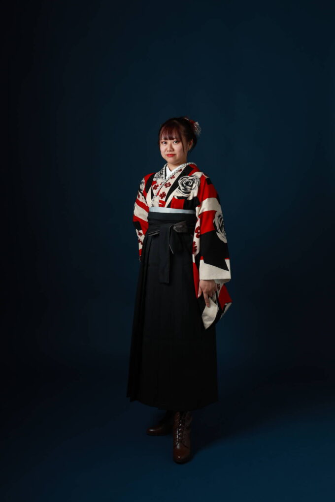 大胆な柄と色遣いが印象的なお着物なので、袴はシンプルなものを合わせてみました!!