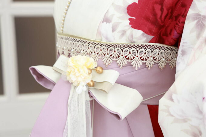 レースの重ね衿を帯と重ねて、甘さも忘れずに!!