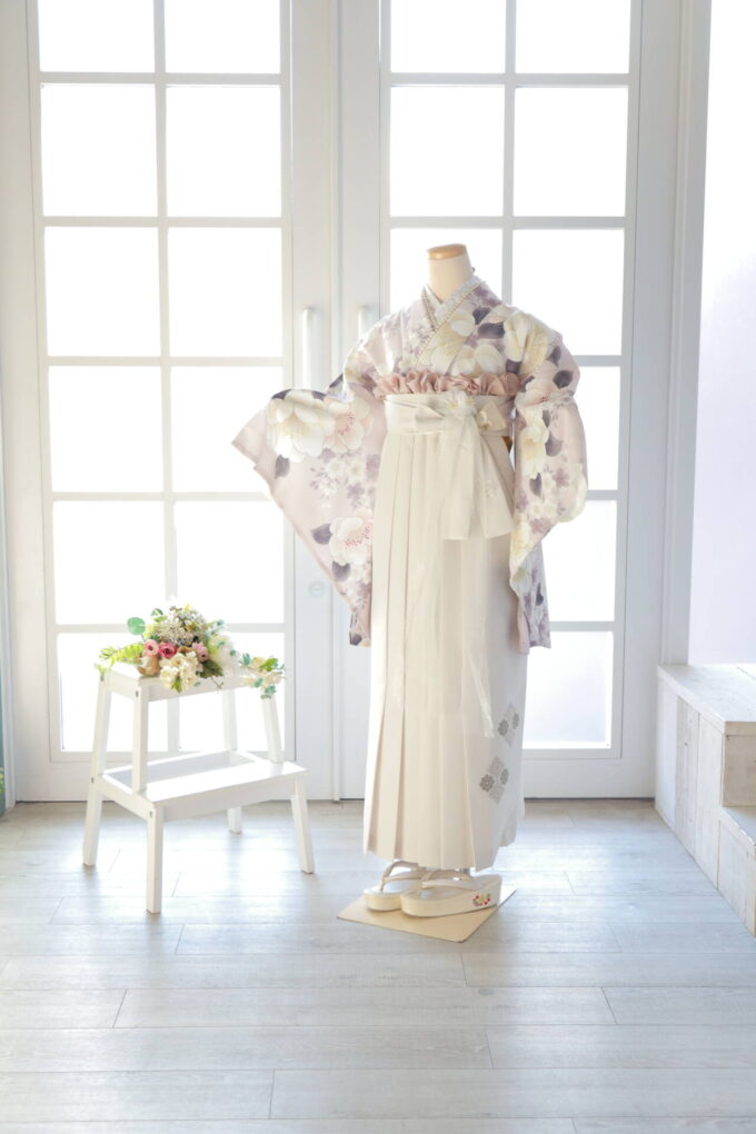 柔らかいピンクに白の袴でトレンドのかわいいコーデを組んでみました!