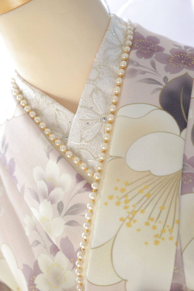 襟はストーンがついた刺繡半衿で華やかに、パールの重衿でもっと可愛さをプラスしました!