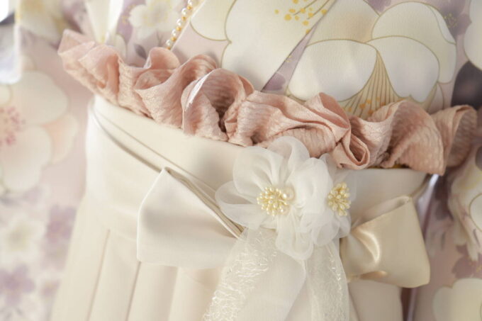 袴がシンプルな分帯揚げを使ってフリルで華やかに!くすみピンクを使って二尺袖のピンクとあわせました
